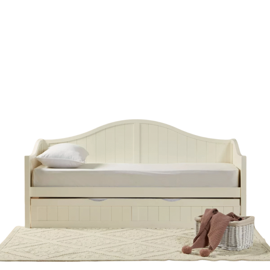 - Plush Upholstered Bed: Soft white fabric with integrated storage drawers under the base for hidden organization.