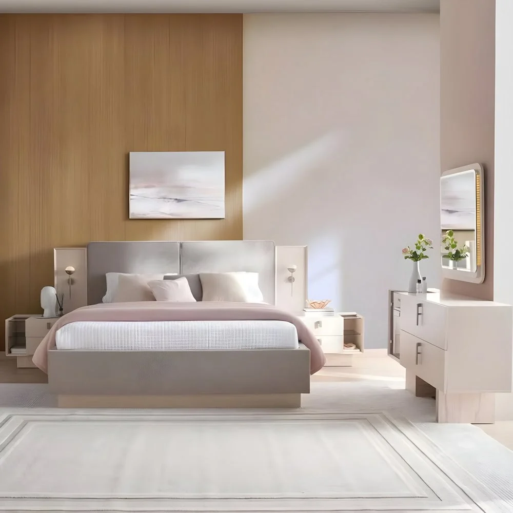 Transform your bedroom into a tranquil haven with the Serene Beige Whisper Bedroom Set, where warm neutral tones meet soft minimalist elegance. Featuring a sleek platform bed with plush gray upholstered headboard, this set harmonizes light beige paneling-inspired accents with subtle blush pink bedding for a calming, spa-like atmosphere. Complemented by matching nightstands, a versatile dresser, and a graceful freestanding mirror, every piece is designed for effortless organization and serene aesthetics. Adorned with gentle wall sconces, an abstract artwork, and fresh florals, the Serene Beige Whisper evokes quiet luxury, ideal for modern retreats that prioritize peace and subtle sophistication.